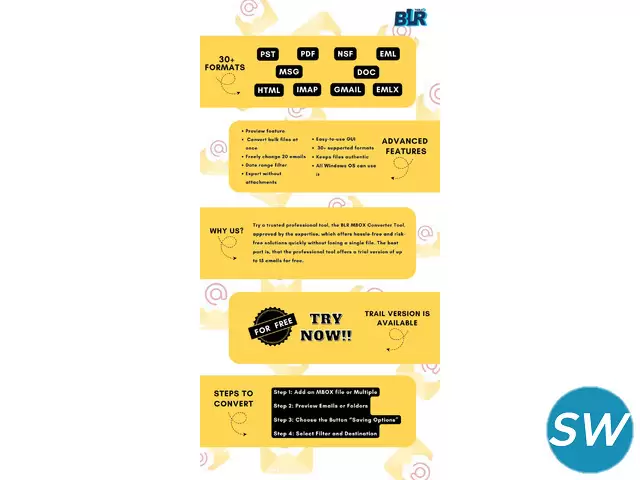 The BLR MBOX Converter Tool provides an efficient and simple solution for converting MBOX files to PST format, supporting up to 15 emails at once without any data loss. It is compatible with over 30+ email formats and various email clients, ensuring fast and reliable conversions for both small and large MBOX files. With its user-friendly interface, the tool is easy to use for both technical and non-technical users, offering a smooth, hassle-free experience with guaranteed data integrity. The BLR MBOX Converter Tool works seamlessly with a broad range of email clients.