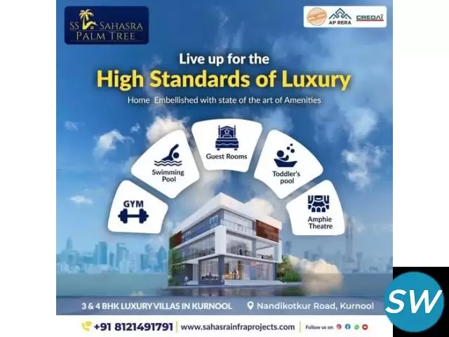 Discover a life of opulence at SS Sahasra Palm Tree, where luxury meets comfort. Our 3BHK and 4BHK independent villas redefine modern living, offering exclusive amenities like a state-of-the-art Gym and a refreshing Swimming Pool. Elevate your lifestyle in the heart of Kurnool.