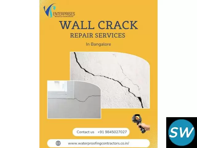 VS Waterproofing provides professional Wall Crack Repair Services in Bangalore, specializing in crack-filling services for both interior and exterior cracks. Our expert team identifies the root cause of wall damage and uses high-quality sealants and advanced techniques to restore structural integrity. Whether it’s hairline cracks or deeper gaps, we offer durable solutions that prevent water seepage and further deterioration.