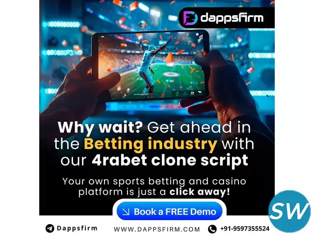 A 4rabet clone script is a ready-made software solution that replicates the functionalities of the popular online betting platform 4rabet, enabling entrepreneurs to launch their own sports betting and casino website swiftly. This clone script includes features such as user-friendly interfaces, payment gateway integrations, and live betting options, ensuring a competitive edge in the market. Dappsfirm offers a 4rabet clone script at minimal cost, providing an affordable opportunity for businesses to enter the online gambling industry.
