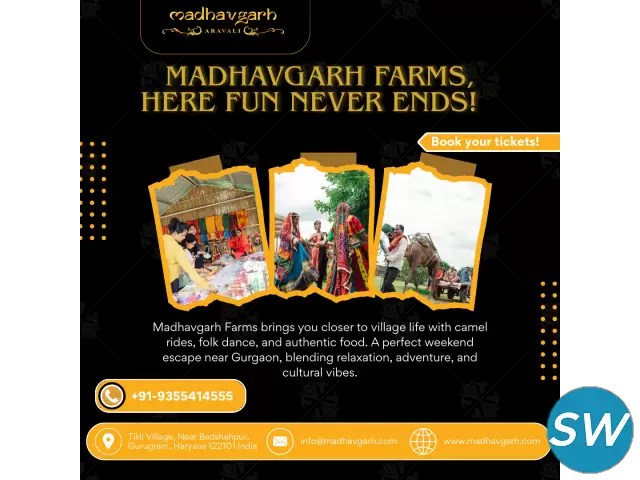 Enjoy a refreshing break at Madhavgarh Farms, the perfect spot for a 1 day outing near Delhi. With adventure sports, cultural programs, and delicious food, it’s the best way to spend quality time with family and friends. You can book your tickets online or get them from the entrance. Have fun!