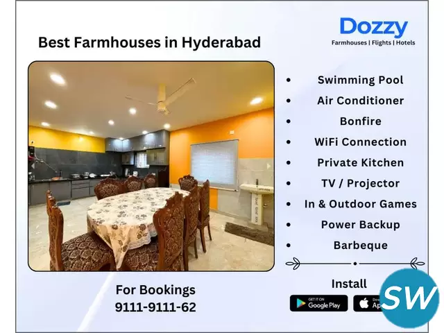 Escape from the city’s noise and relax with the loved ones at our farmhouse rentals with a swimming pool. Our farmhouses are located in peaceful locations close to Hyderabad and provide large interior spaces, lots of greenery, and private pools for limitless enjoyment and relaxation. To make your stay even more enjoyable, take advantage of modern amenities, comfortable outdoor chairs, and BBQ grill. Enjoy the perfect combination of comfort, privacy, and peace, whether it's for a special occasion or an ordinary get-together. The open areas are perfect for children to play in, and for adults to relax by the pool. Everything is set up for your comfort, including ample parking and kitchen that are fully furnished. Make wonderful memories with your family in a unique and refreshing environment.