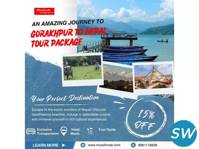 Explore Nepal's breathtaking landscapes, vibrant culture, and profound spiritual heritage with a journey through the country’s most enchanting destinations: the historic Kathmandu, the scenic beauty of Pokhara, Chitwan’s wildlife haven, Nagarkot’s panoramic vistas, and the sacred Manakamana Temple. For an exciting adventure close to home, Musafircab offers the best Gorakhpur to Nepal Tour Package, which is the ideal choice. Our comprehensive package includes a customized itinerary to suit different travel preferences, whether for family trips, solo journeys, or pilgrimages. The package covers travel arrangements, accommodations, guided tours, and meals, ensuring a seamless travel experience. Our dedicated support team is available 24/7 to assist you in planning an unforgettable and hassle-free trip to Nepal.