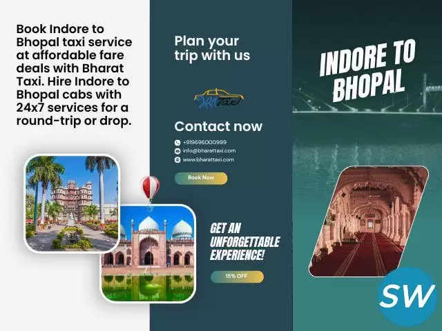 Book reliable Indore to Bhopal cabs with Bharat Taxi for a safe and comfortable ride. Choose from a range of cabs at affordable rates with 24/7 customer support. Enjoy easy booking, experienced drivers, and on-time service.
