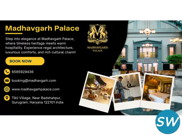Madhavgarh Palace is an exquisite luxury resort in Gurgaon, inspired by royal heritage and surrounded by serene landscapes. Perfect for destination weddings, corporate offsites, family vacations, and weekend escapes, the palace offers luxurious rooms, grand banquet halls, lush lawns, fine dining, and world-class hospitality.