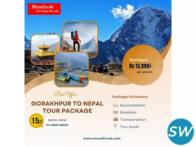 Start an unforgettable Nepal Tour Package from Gorakhpur with our special tour package. It combines exciting adventures and rich cultural experiences. Whether you love thrills or history, this package offers a rewarding journey through Nepal's stunning landscapes and unique traditions. For adventure lovers, this tour includes thrilling activities and scenic escapades. Witness the majestic Himalayas with visits to famous viewpoints like Sarangkot in Pokhara, which are ideal for sunrise vistas. Visit Lumbini, the birthplace of Lord Buddha, and marvel at its serene monasteries and ancient stupas. Wander through the historic streets of Kathmandu to discover Durbar Square, Swayambhunath, and Boudhanath Stupa, each showcasing Nepal's artistic and spiritual traditions. This package includes comfortable transportation from Gorakhpur, expert-guided tours, and carefully selected accommodations to ensure your journey is seamless and memorable. For more information call us.