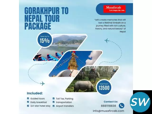 Nepal offers breathtaking landscapes, profound cultural heritage, and thrilling adventures, making it the perfect getaway for every traveller. At Musafircab, we ensure a seamless travel experience with customizable itineraries tailored to your preferences and budget. From the majestic Himalayas to ancient temples and serene lakes, your journey through Nepal will be filled with unforgettable memories. We offer a flexible Gorakhpur To Nepal tour Package that can be customized to match your preferences and travel duration. From the majestic Himalayas to historic temples and serene lakes, every moment in Nepal will be a memory to cherish.